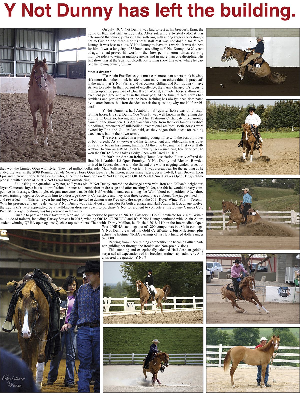 - Y Not Dunny earns Canada’s first NRHA bronze in Canada’s first NRHA Part Arabian Futurity held recently at Y Not Farms Spirit of Excellence